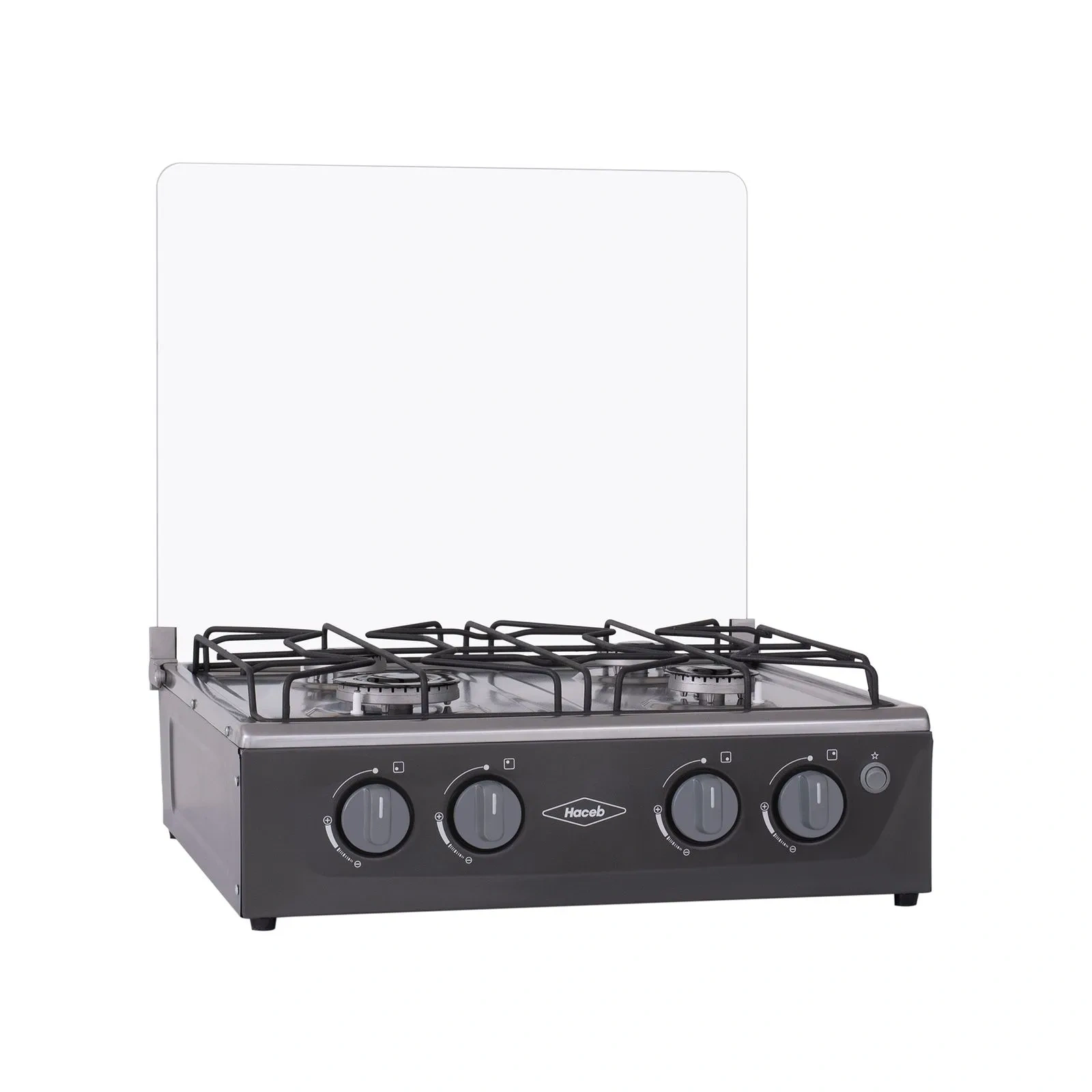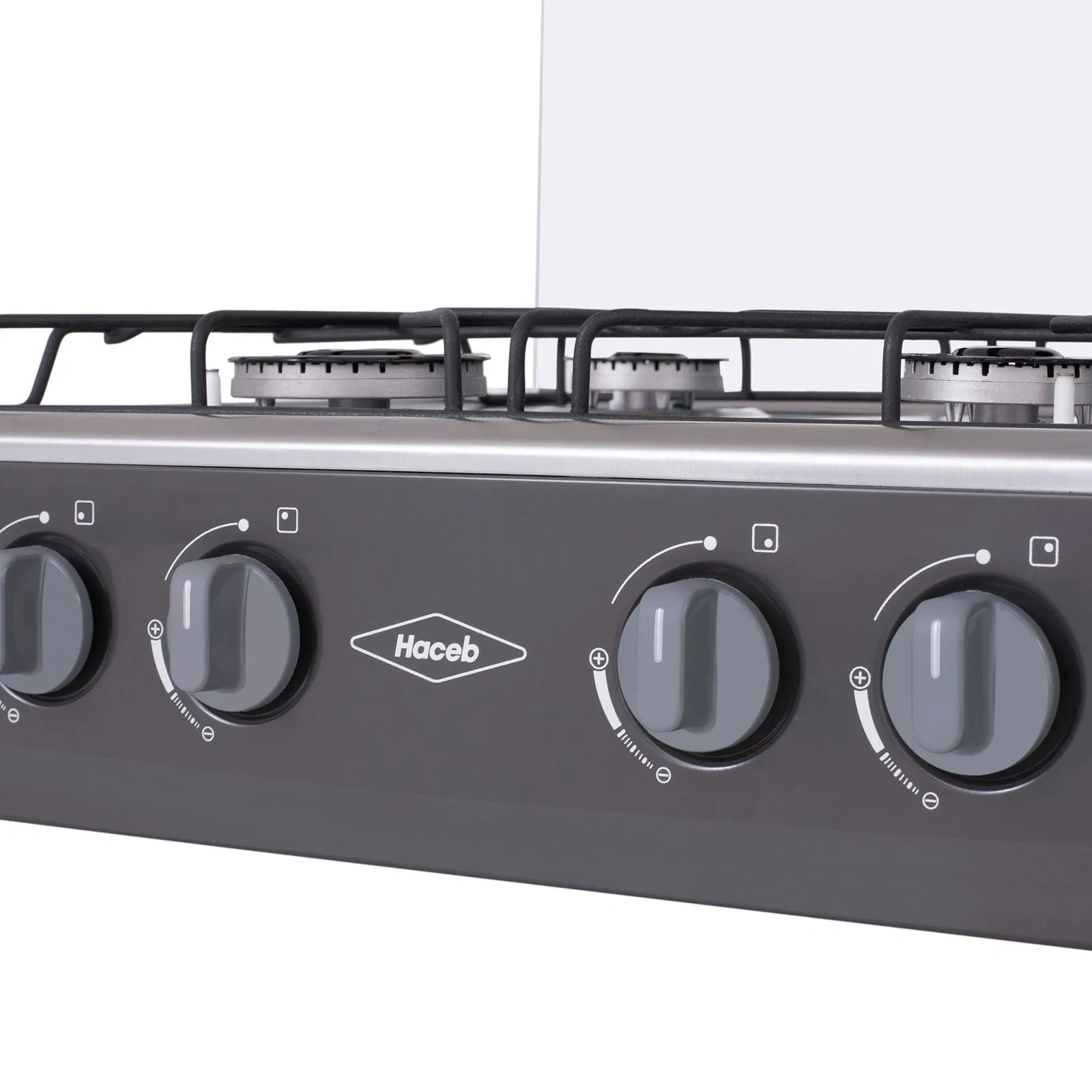 Vidrio templado superior, estructura inferior robusta, fuentes de calor con diferentes tamaños,parrillas en alambrón con puntos de apoyo óptimos, amplia mesa en acero inoxidable, encendido eléctrico,perillas ergonómicas con diseño único y fáciles de manejar