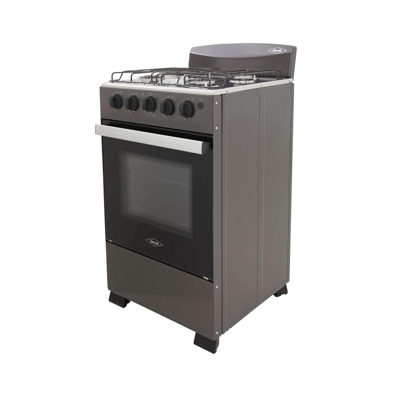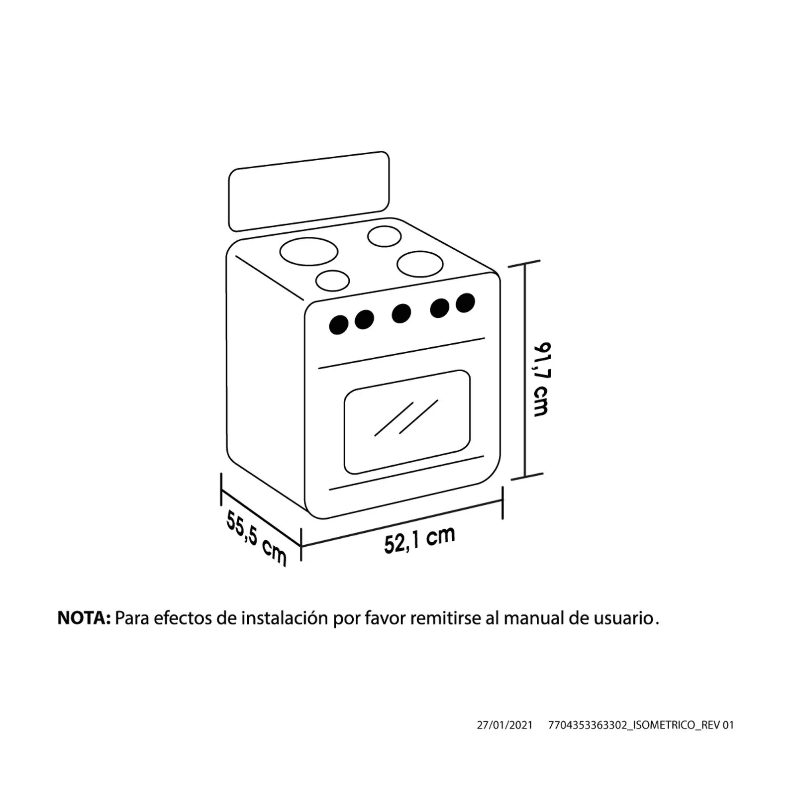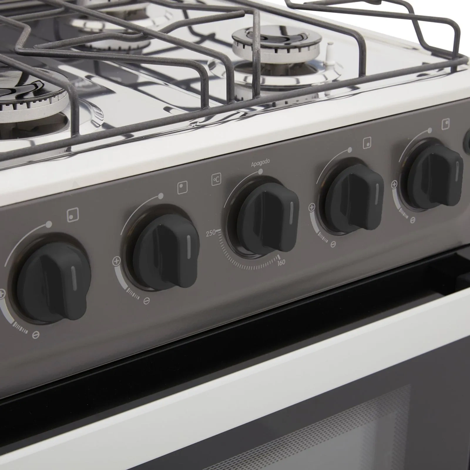 Espaldar de torre, 1 quemador rápido y 3 semirápidos, 5 perrillas, fogón 35% más potente,parrilla antideslizante, visor del horno 65% más amplio, encendido eléctrico de las fuentes de calor
