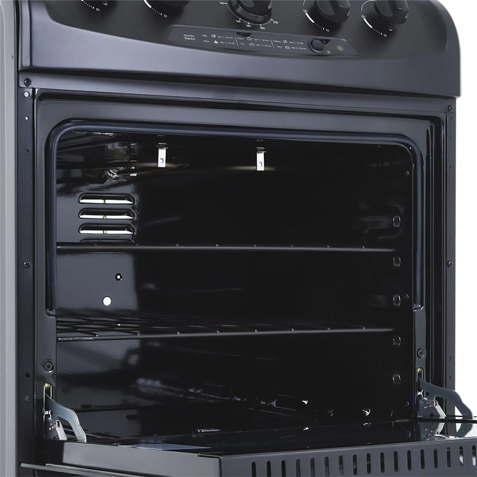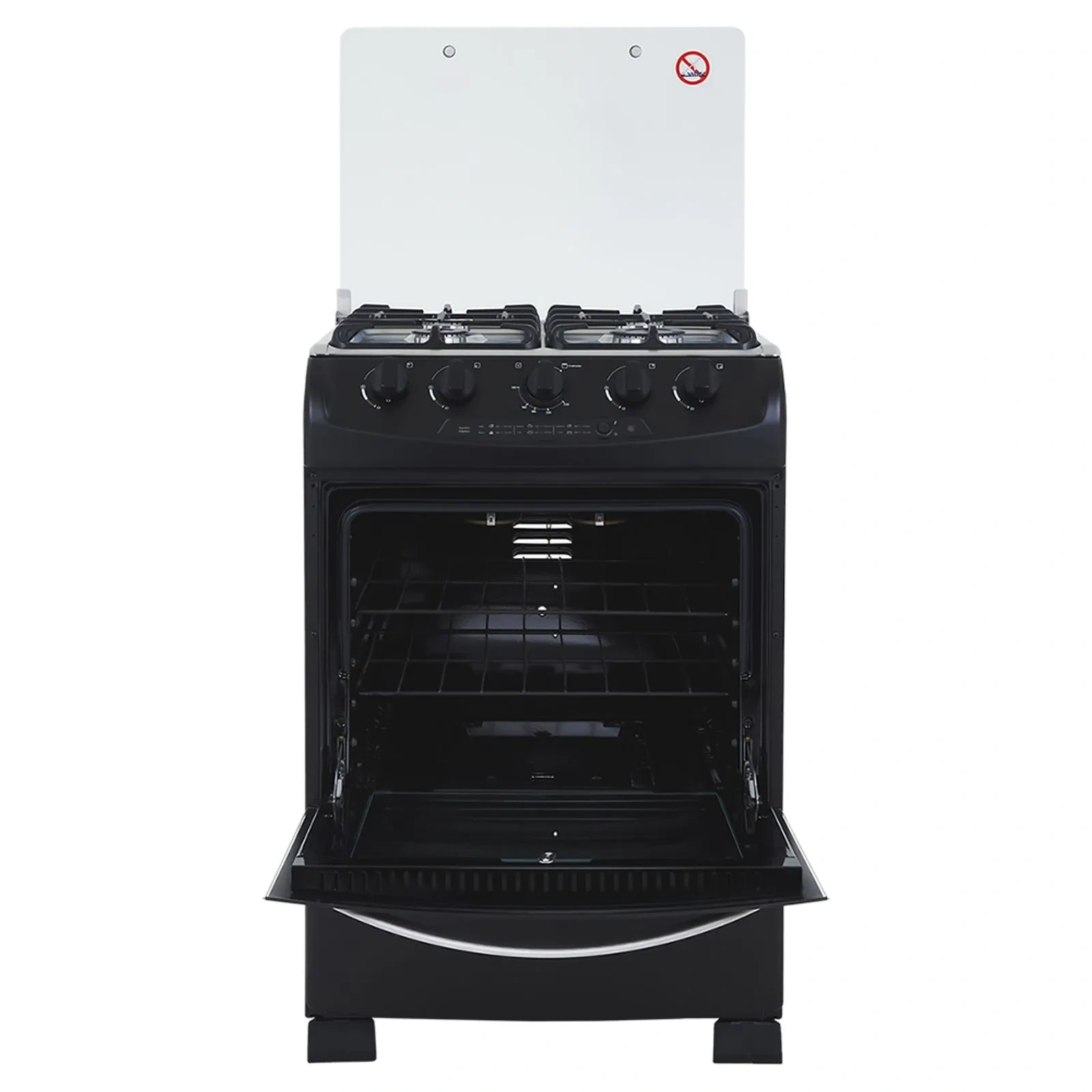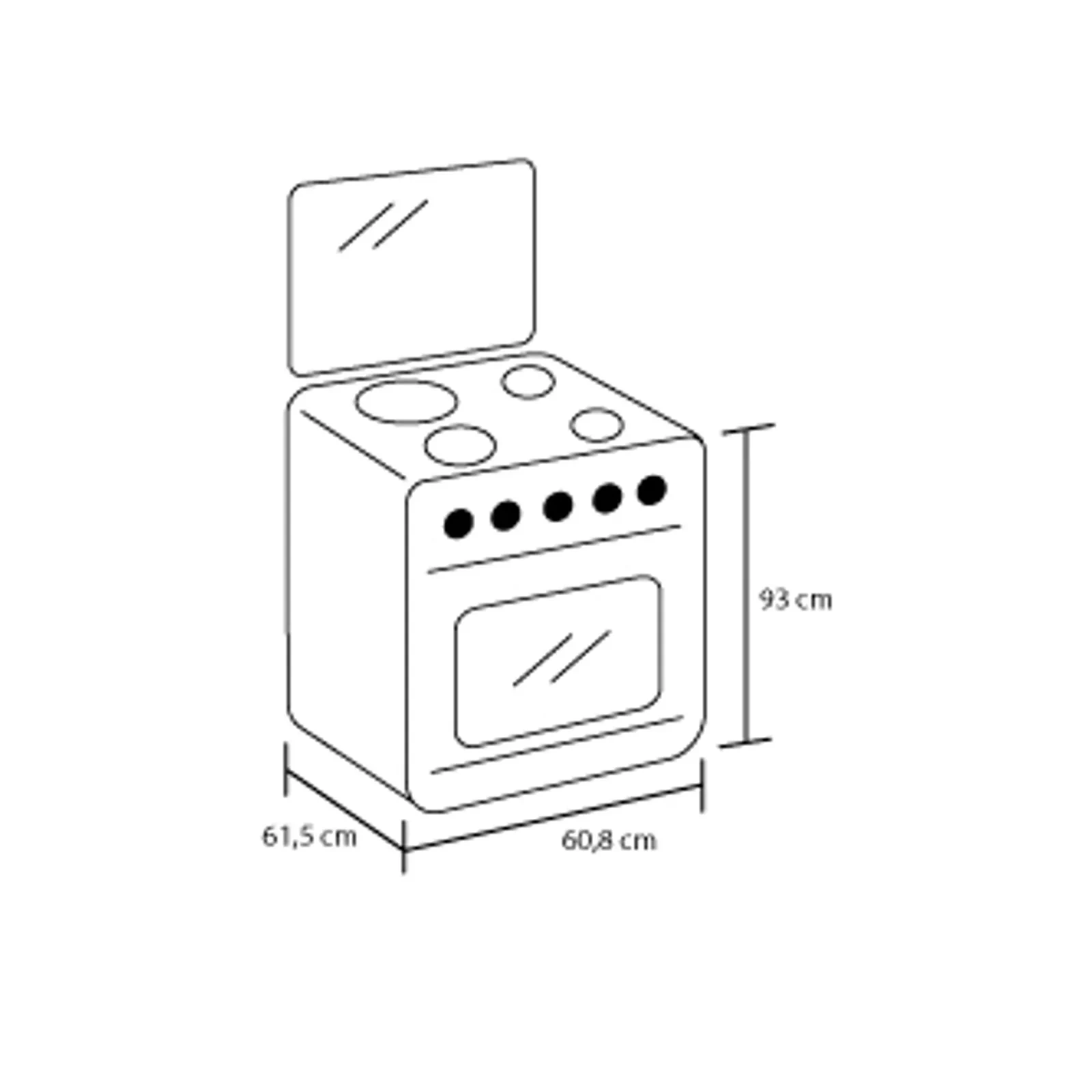 Estufa de piso 60 cms a gas natural, 4 puestos con encendido eléctrico, cubierta en acero inoxidable, tapa de vidrio,parillas en hierro fundido, gratinador en curvas, sistema de termoseguridad y puerta del horno desmontable.
