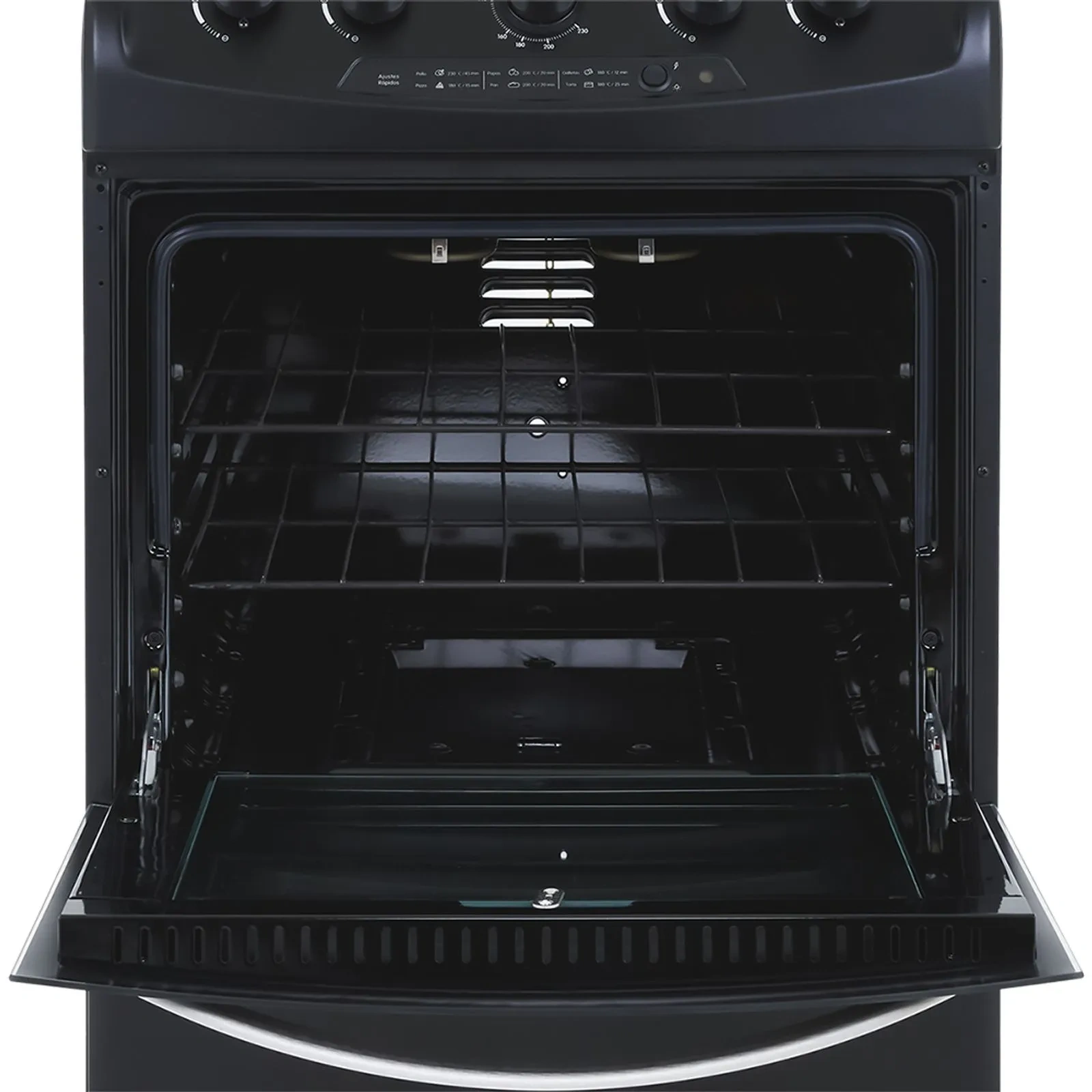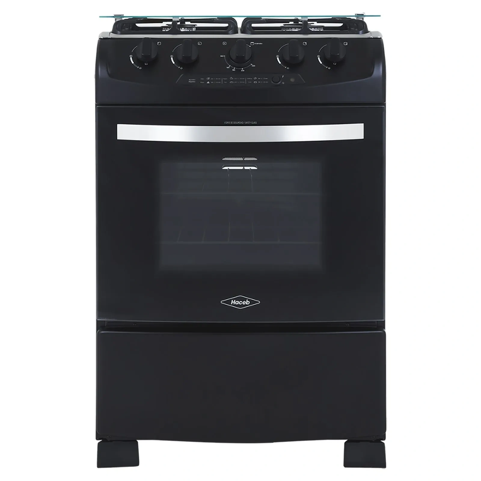 Estufa de piso 60 cms a gas propano, 4 puestos con encendido eléctrico, cubierta en acero inoxidable, tapa de vidrio,parillas en hierro fundido, gratinador en curvas, sistema de termoseguridad y puerta del horno desmontable.