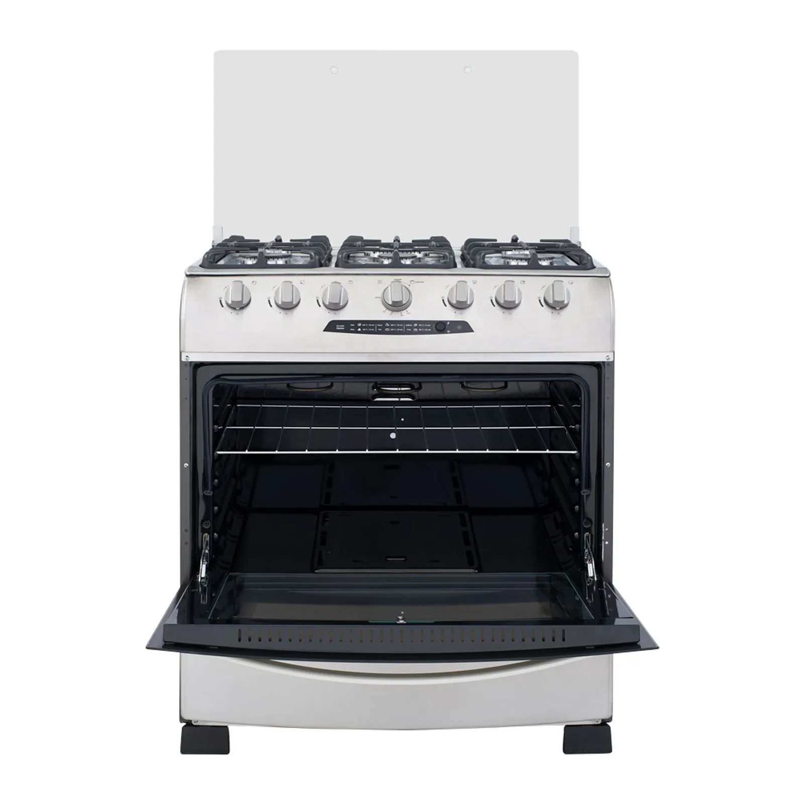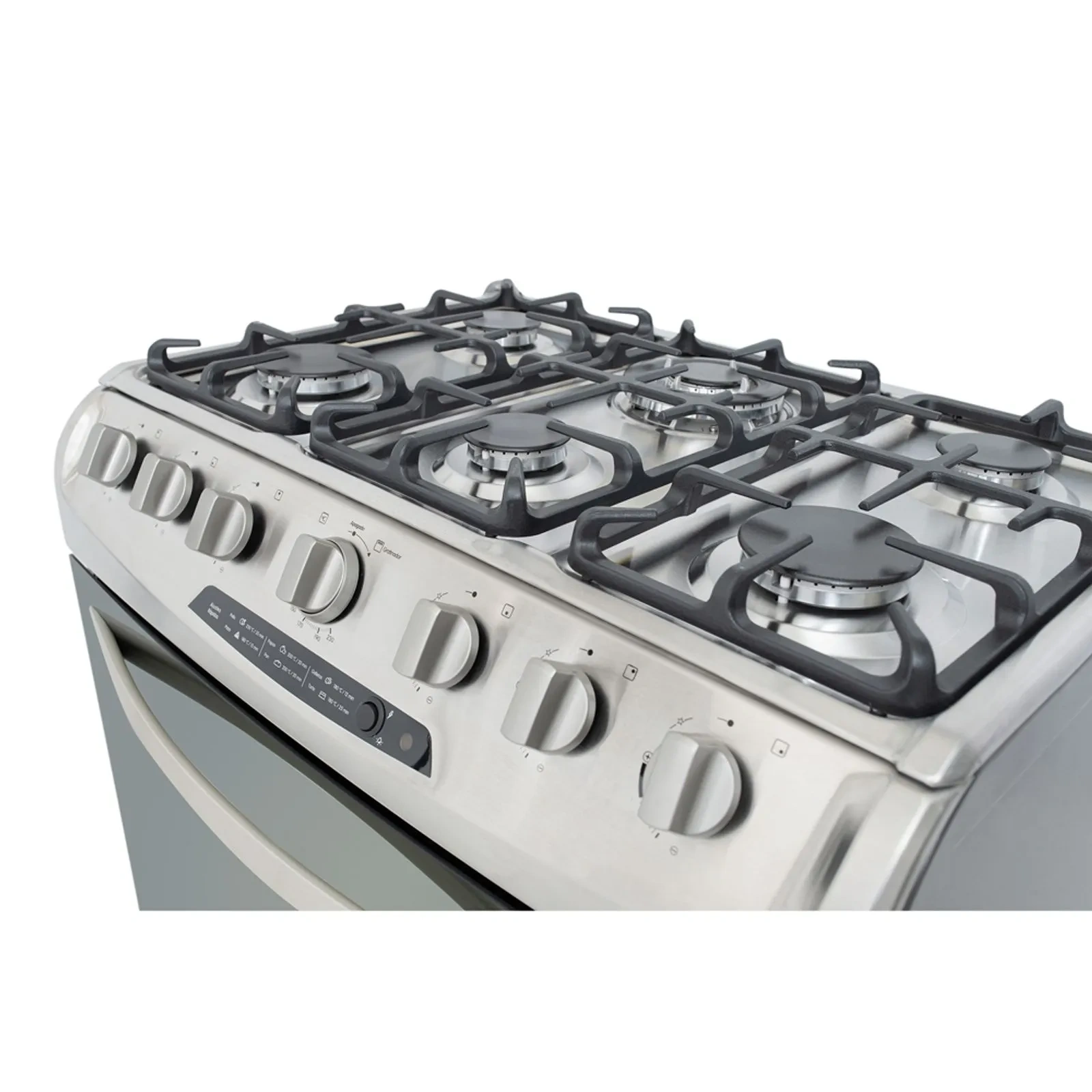 Clásico acero inoxidable, encendido eléctrico en mesa,parrillas en hierro fundido,perillas ergonómicas y robustas,puerta del horno desmontable, gratinador eléctrico en curvas,puerta del horno con visor amplio, keypad con recetario, interbloqueo y termoseguridad en el horno.