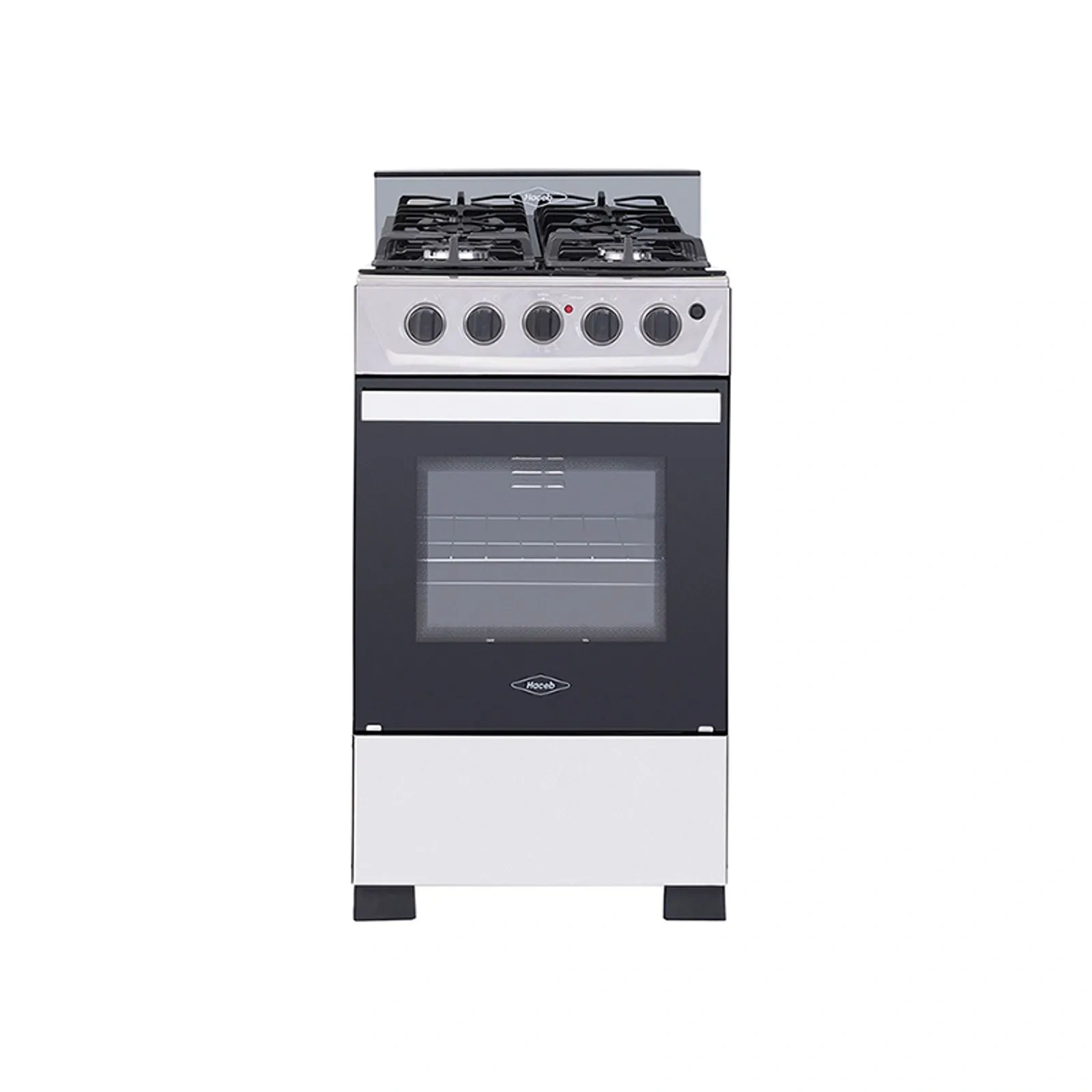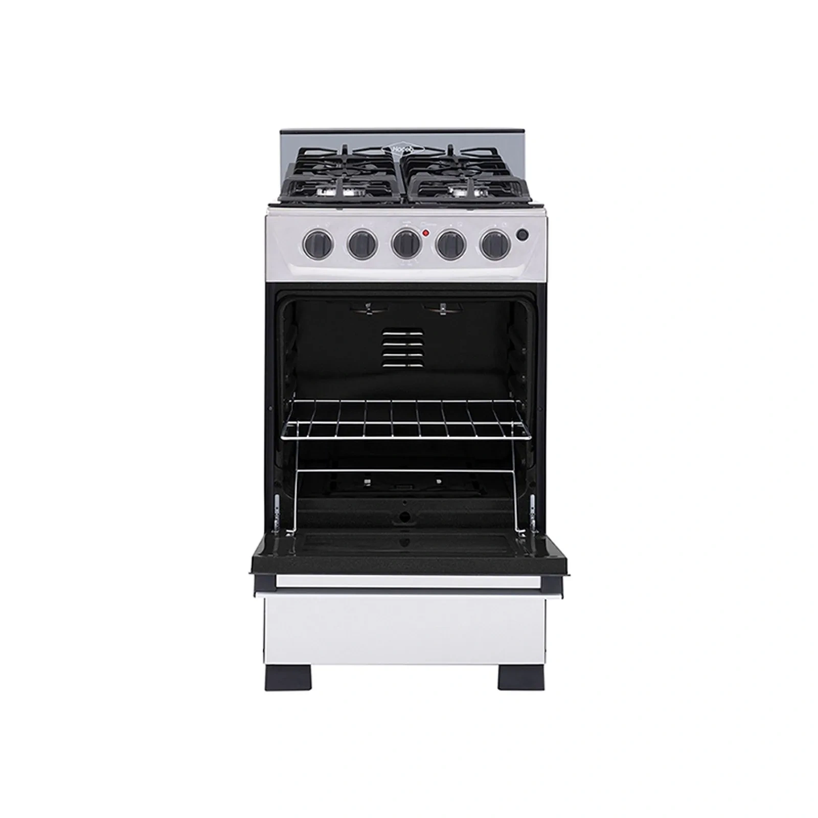 Mesa en cristal, 1 quemador rápido y 3 semirápidos, 5 perillas, entrepaño retráctil, gratinador en curvas,parrilla en hierro fundido,puertas del horno con visor