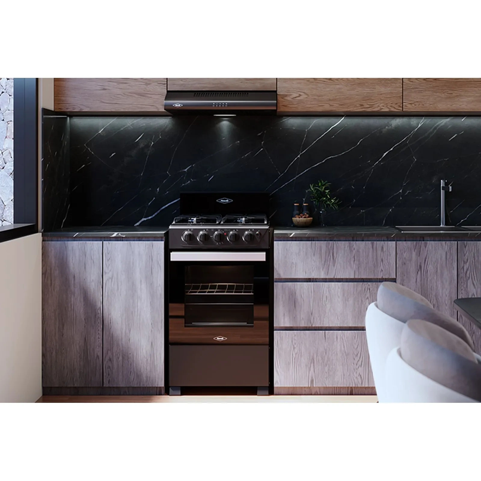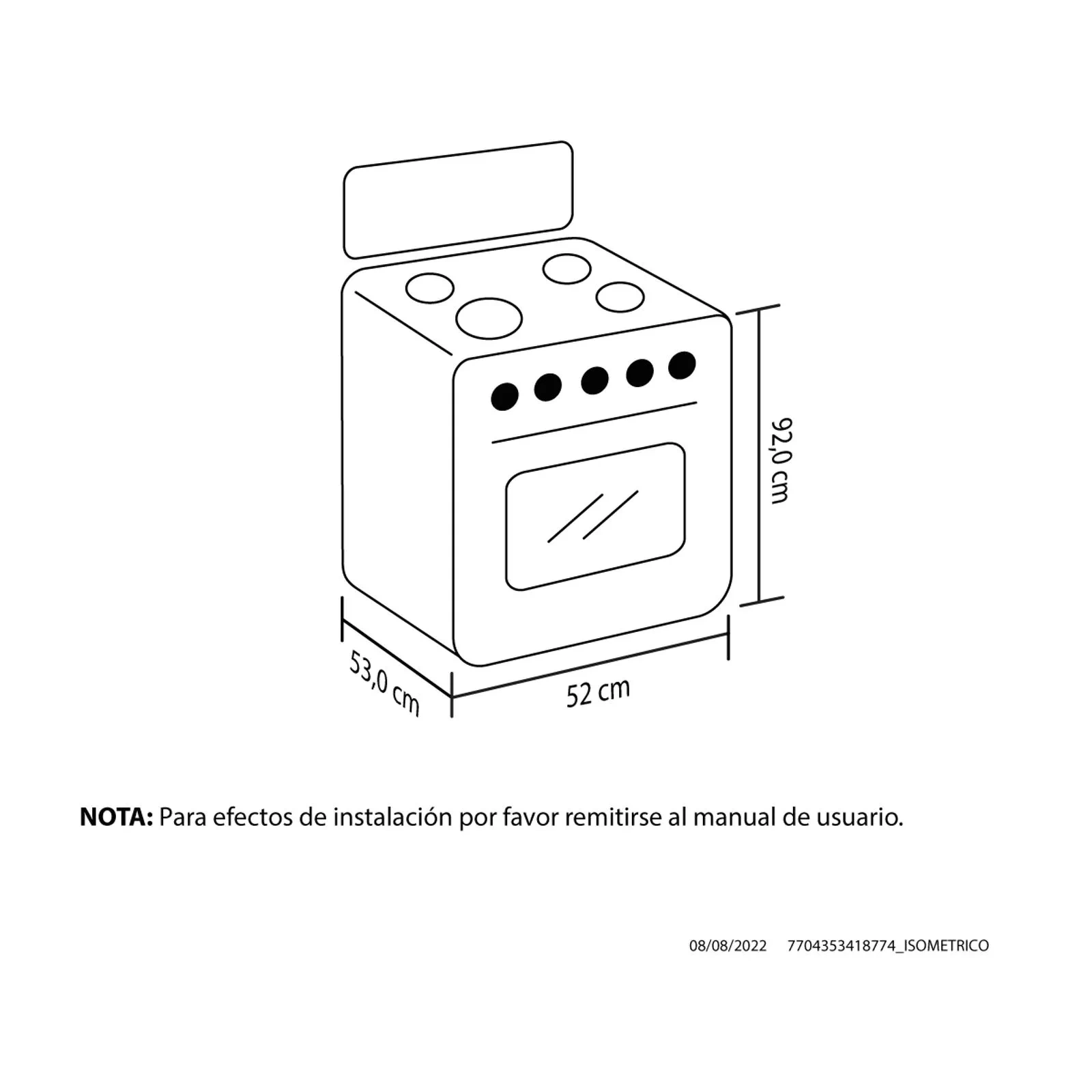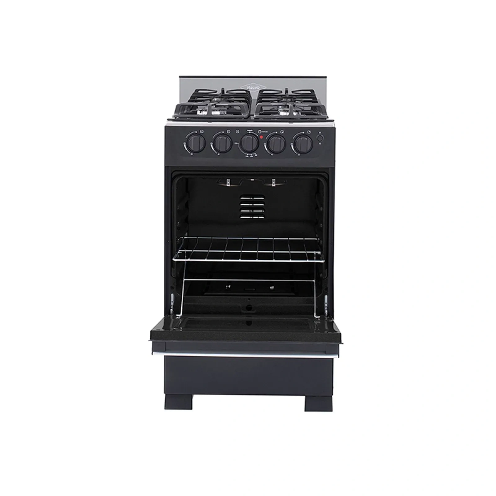 Mesa en cristal, 1 quemador rápido y 3 semirápidos, 5 perillas, entrepaño retráctil, gratinador en curvas,parrilla en hierro fundido,puertas del horno con visor
