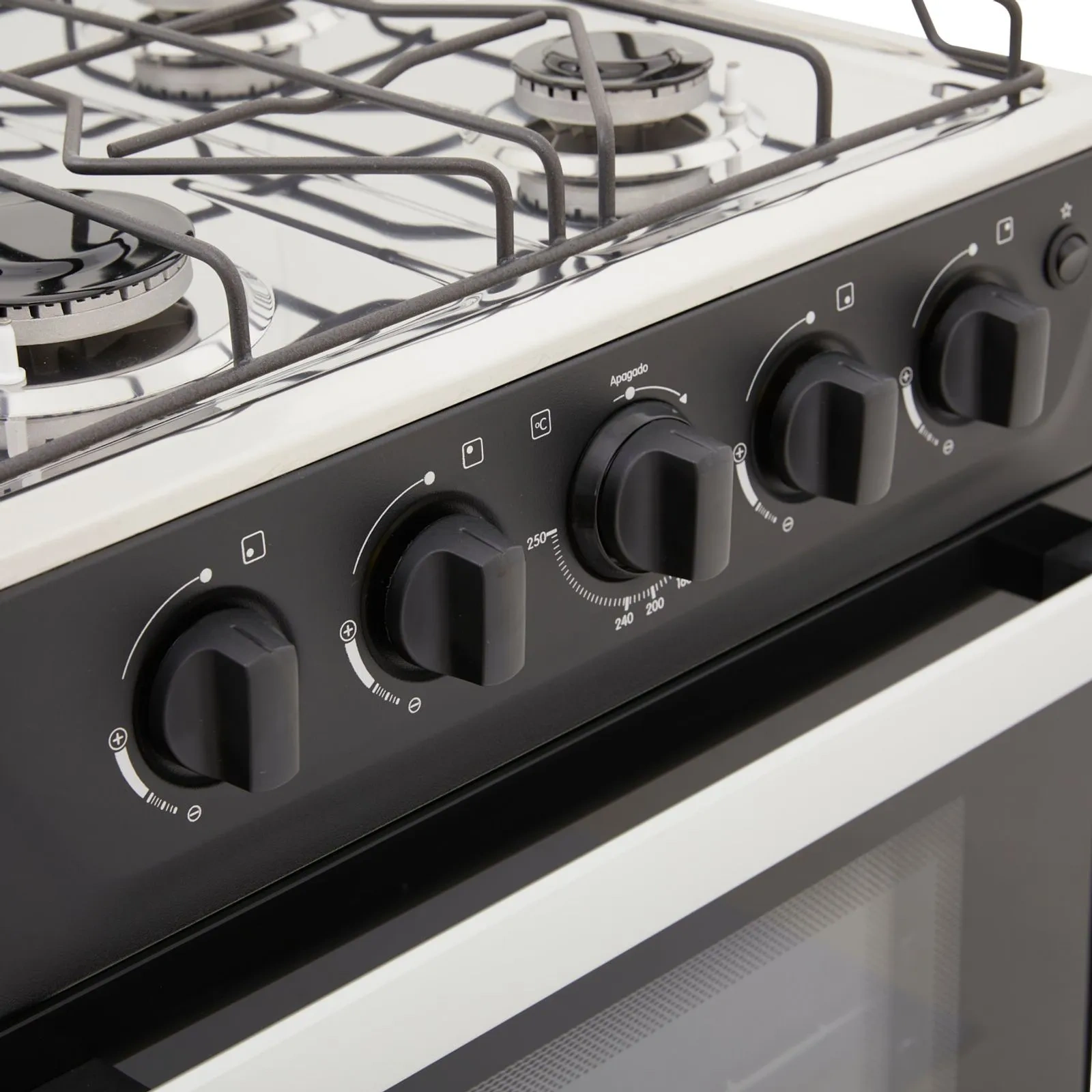 Espaldar de vidrio, 1 quemador rápido y 3 semirápidos, 5 perillas, fogón 35% más potente,parrilla antideslizante, visor del horno más amplio,perillas ergonómicas y robustas.
