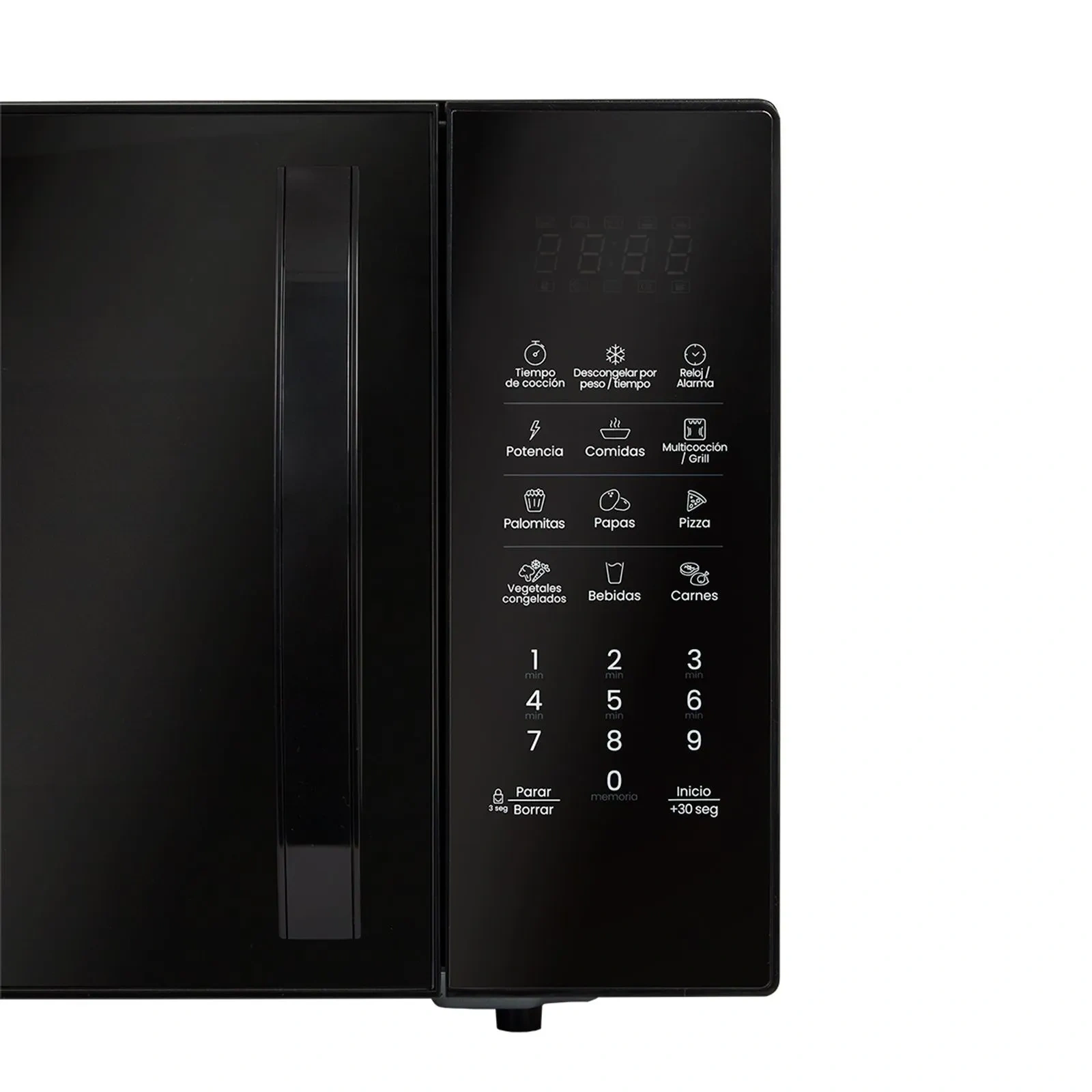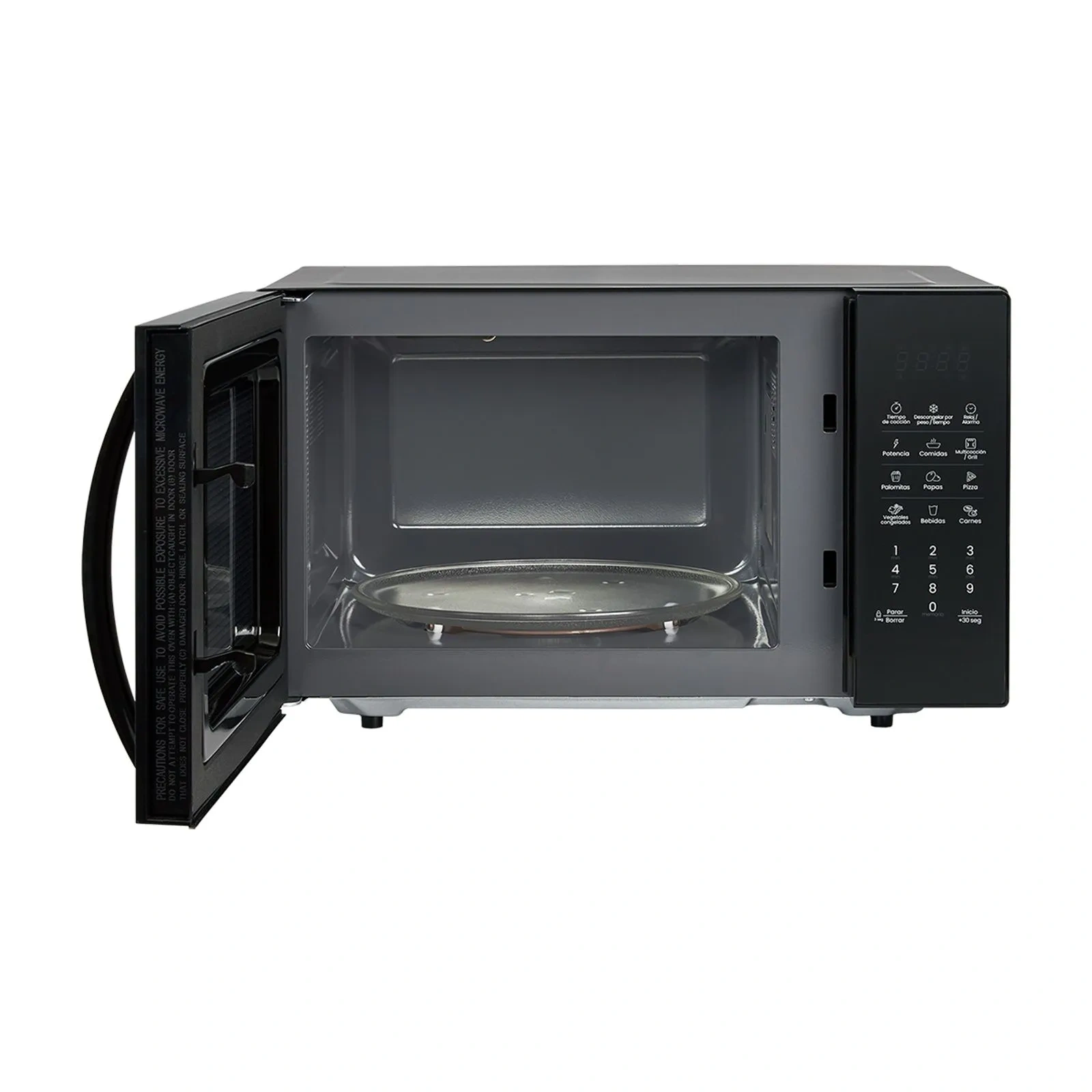 Potencia de entrada 1250W / Potencia de salida 700W / Frecuencia 2450 MHz / Tiempo maximo de operación 99min – 99seg / Plato giratorio / Panel digital / Pantalla para visualizacion / Apertura por medio de manija
